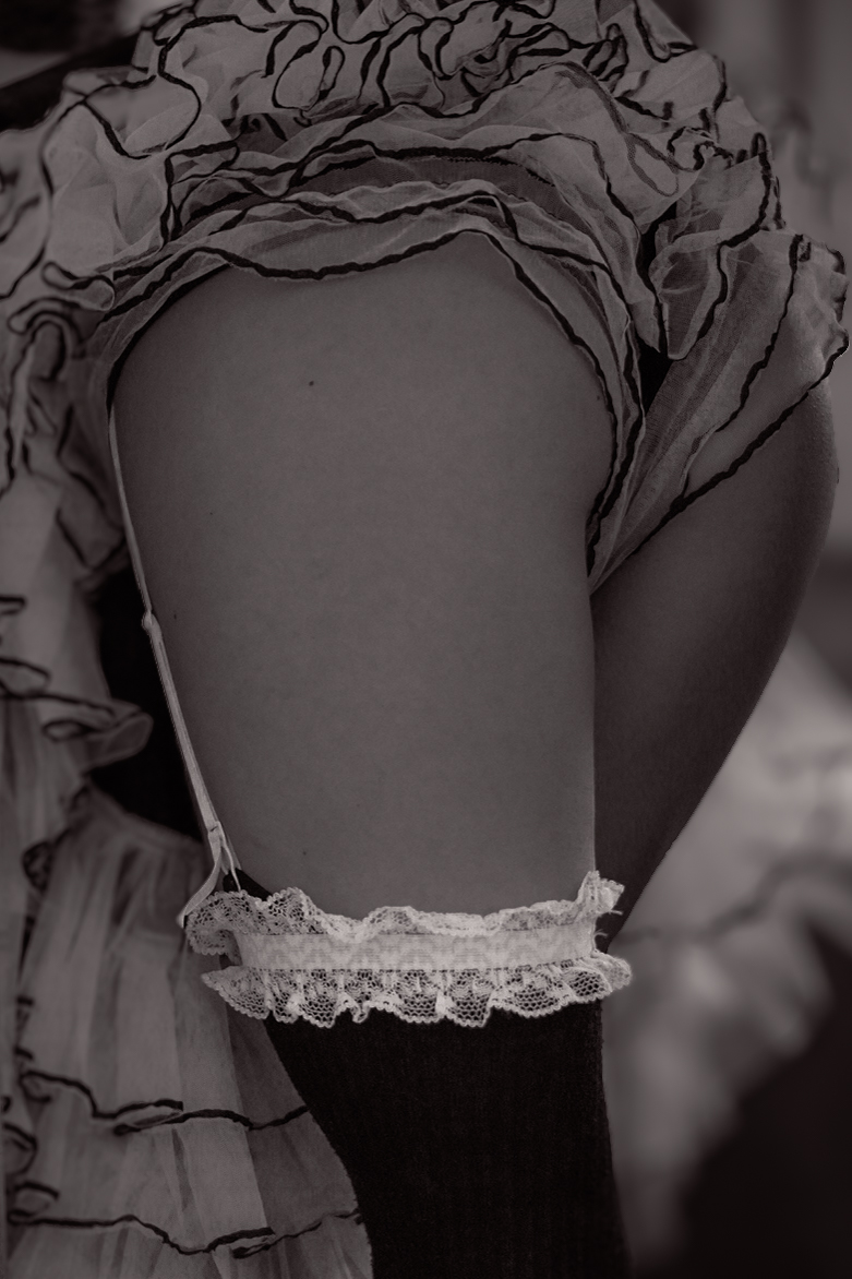 Photo en noir et blanc d'une femme portant une jupe à détails dentelle et une chaussette longue.